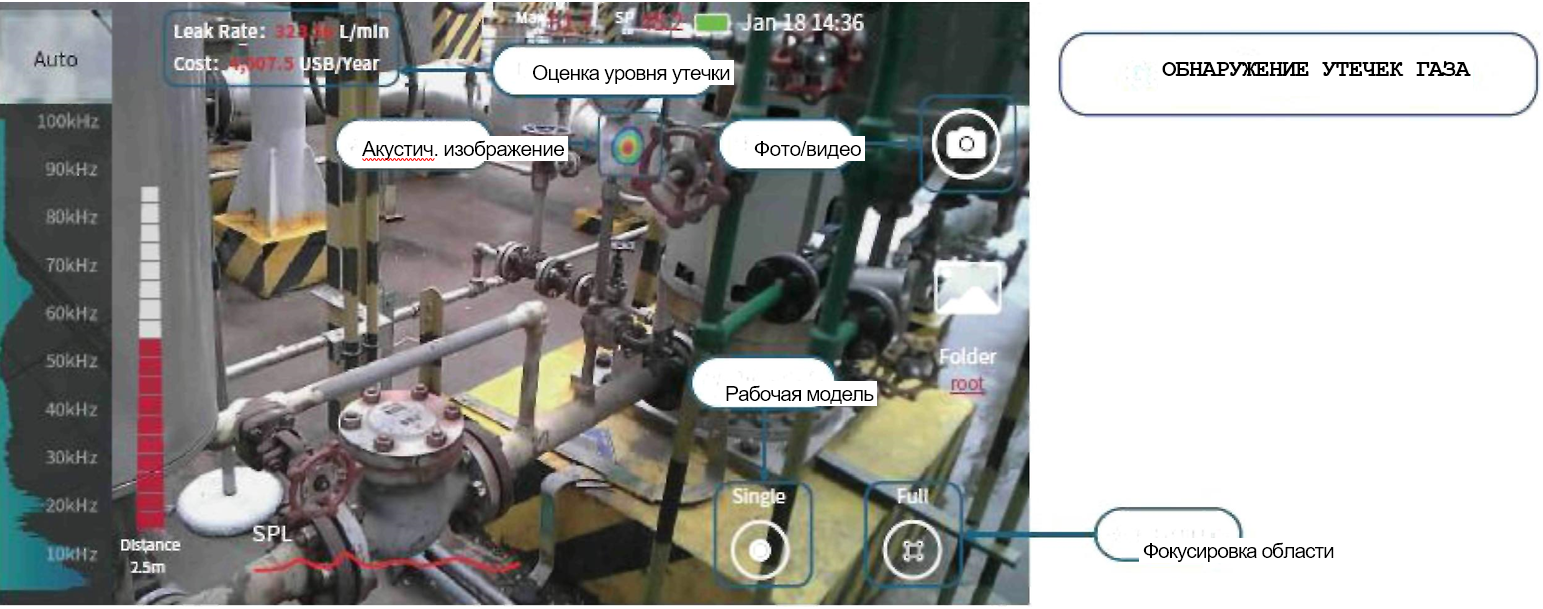 - Оценка скорости утечки: Оценка скорости утечки газа и стоимости потерь в соответствии с типом газа, давлением и другими параметрами, а также уровнем звукового давления в реальном времени.