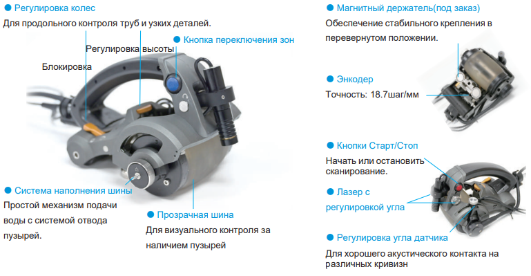 - Наличие бесконтактного магнитного прижима роликового сканера для повышения качества и производительности контроля основного металла;